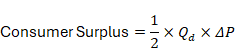 where Qd is the quantity at equilibrium and △P is the difference between the maximum price consumers are willing to pay and the equilibrium price. For example, if consumers would pay up to $100 for a product but can buy it for $70, and 1,000 units are sold, the surplus is 1⁄2×1,000×(100-70)=$15,000.