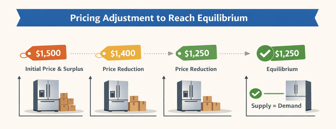 Imagine a company that sells double‑door refrigerators. It initially charges $1,500 per unit but finds that consumers buy fewer than expected, leaving warehouses full. To attract buyers, the company lowers the price to $1,400. Sales improve but inventory still sits on shelves. After another cut to $1,250, demand rises enough to clear the surplus. At this price, the quantity sold matches the quantity produced and the firm reaches equilibrium.