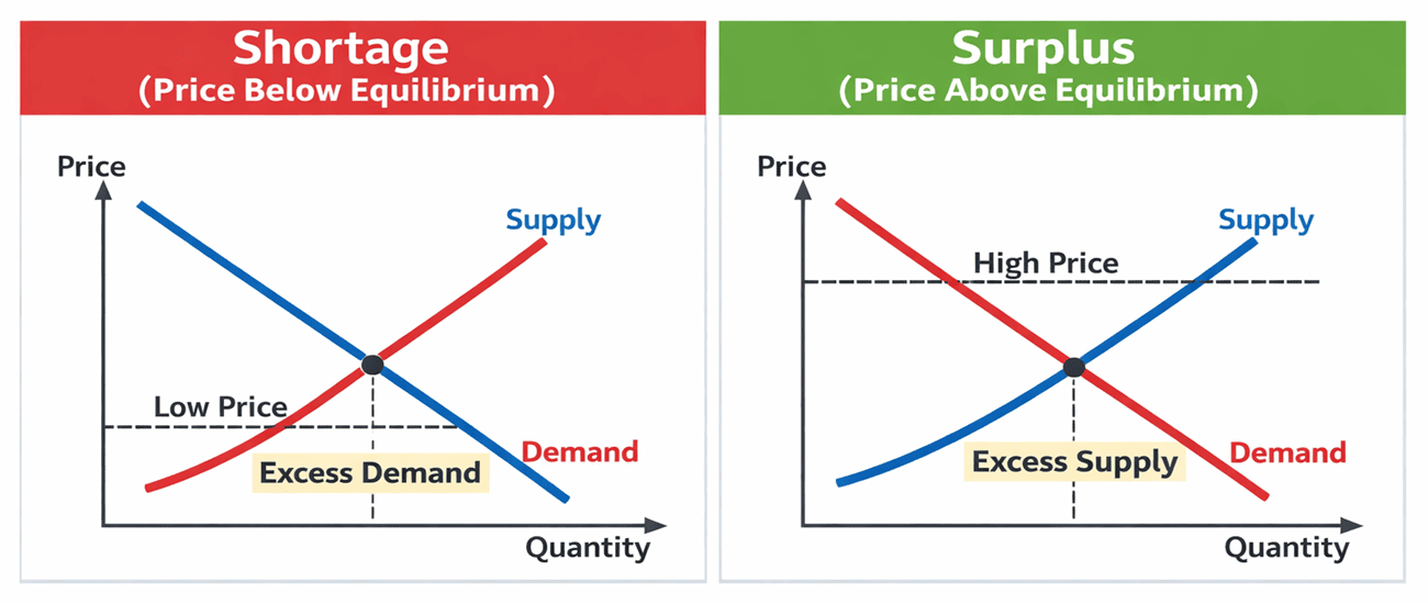 - Surplus (price above equilibrium): At a high price, producers supply more than consumers want. Goods accumulate in warehouses. To reduce the excess, sellers cut prices and scale back production. As prices fall, demand rises and supply contracts until the surplus disappears.