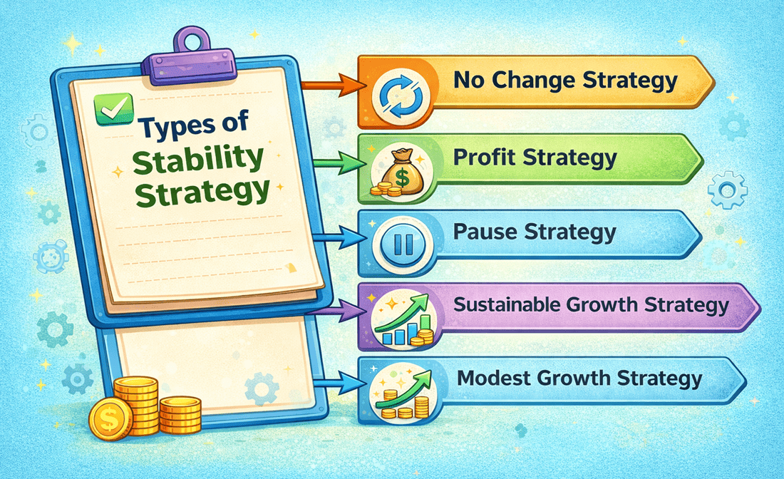 A stability strategy can serve as a strategic pause or a conservative approach when markets are turbulent. It allows companies to consolidate operations, improve efficiency, and maintain profits without taking unnecessary risks. Yet, it is not a long‑term solution. Over time, businesses must innovate or expand to stay competitive.