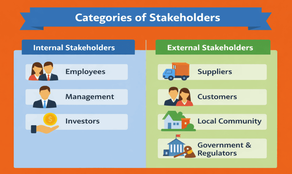 Stakeholders are usually grouped into internal and external types. Internal stakeholders work within the organization. These include employees, managers, and investors. Their main concerns are job security, performance, growth, and returns. External stakeholders are outside the organization but are still affected by it. These include customers, suppliers, governments, and local communities. They care about product quality, fair pricing, legal compliance, and social impact.
