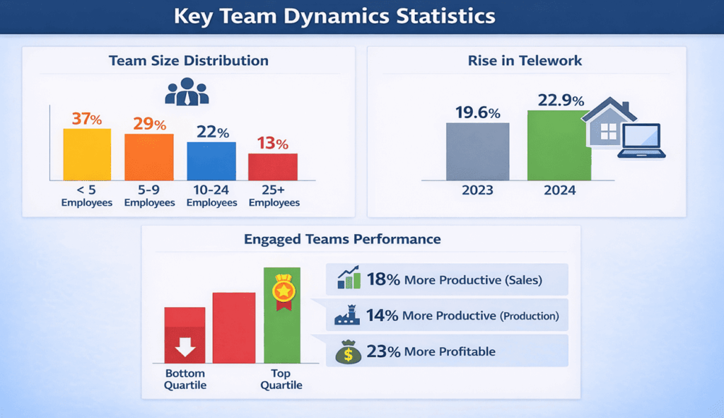 Knowing how different groups function helps leaders design better teams. It can also improve morale and productivity. Gallup’s meta‑analysis of 183,806 teams found that highly engaged teams are 18% more productive in sales, 14% more productive in operational tasks and 23% more profitable than teams with low engagement. These performance gains show why paying attention to group dynamics is not just academic but practical.